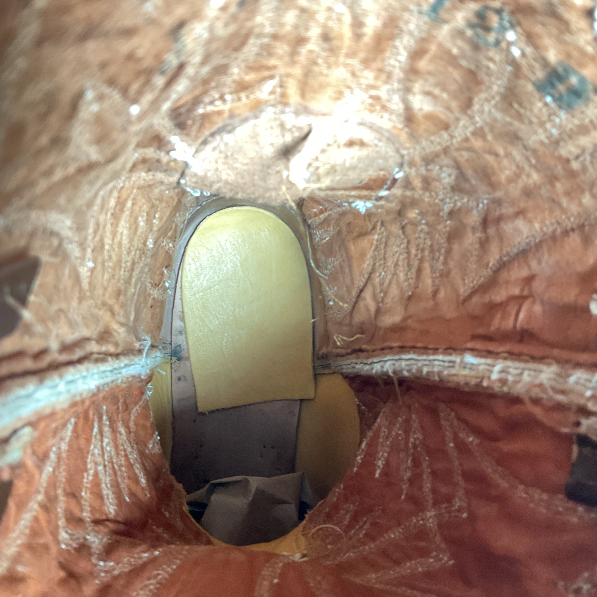 Pull tab on the right boot was not sewn properly. See photo 17.